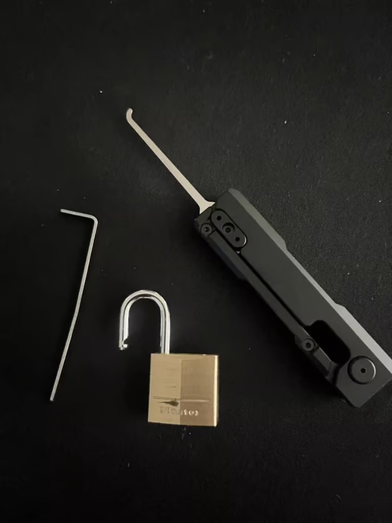 With a quick flip of the wrist you can deploy a hook or a rake and then lock it into place to use. After you get your open, you can flip your wrist again, and make the pick disappear like magic. This will no doubt become a conversation starter for sure.